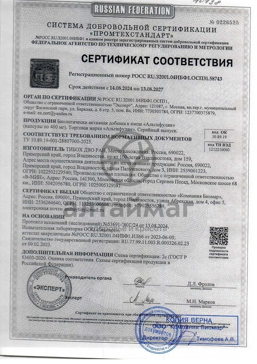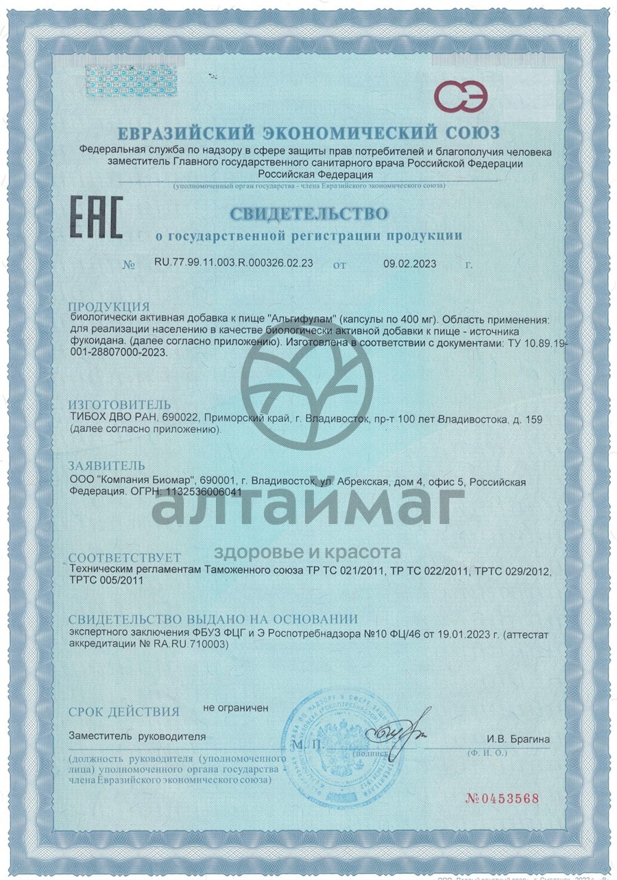 АЛЬГИФУЛАМ –- 100% фукоидан, полисахарид фукуса пузырчатого.