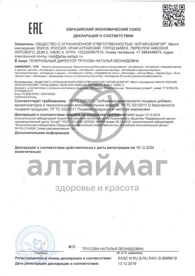 Безалкогольный бальзам Алтайский на меду производителя "Алтай-Селигор".
