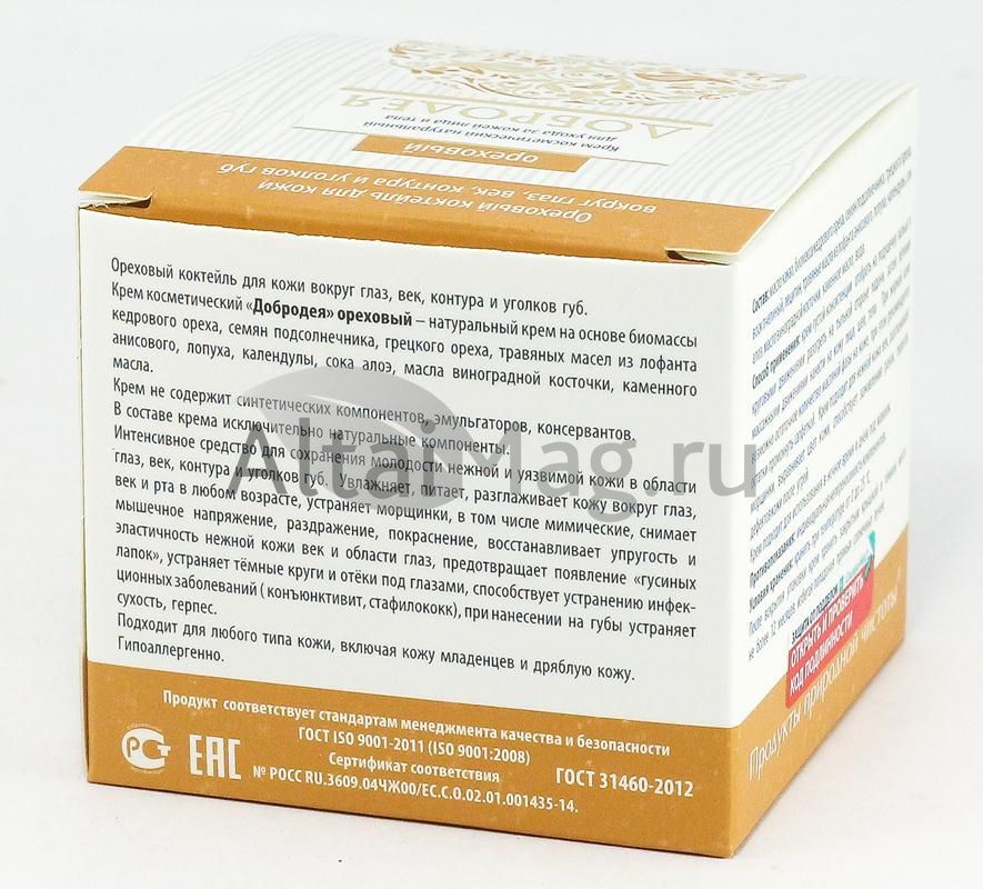 Крем «Ореховый» серии «Добродея» - интенсивное средство для сохранения молодости нежной и уязвимой кожи в области глаз, век, контура и уголков губ. Увлажняет, питает, разглаживает кожу вокруг глаз, век и рта в любом возрасте, устраняет морщинки, в том числе мимические, снимает мышечное напряжение, раздражение, покраснение, восстанавливает упругость и эластичность нежной кожи век и области глаз, предотвращает появление «гусиных лапок», устраняет темные круги и теки под глазами, способствует устранению инфекционных заболеваний – конъюктивит, стафилококк, при нанесении на губы устраняет сухость, герпес.